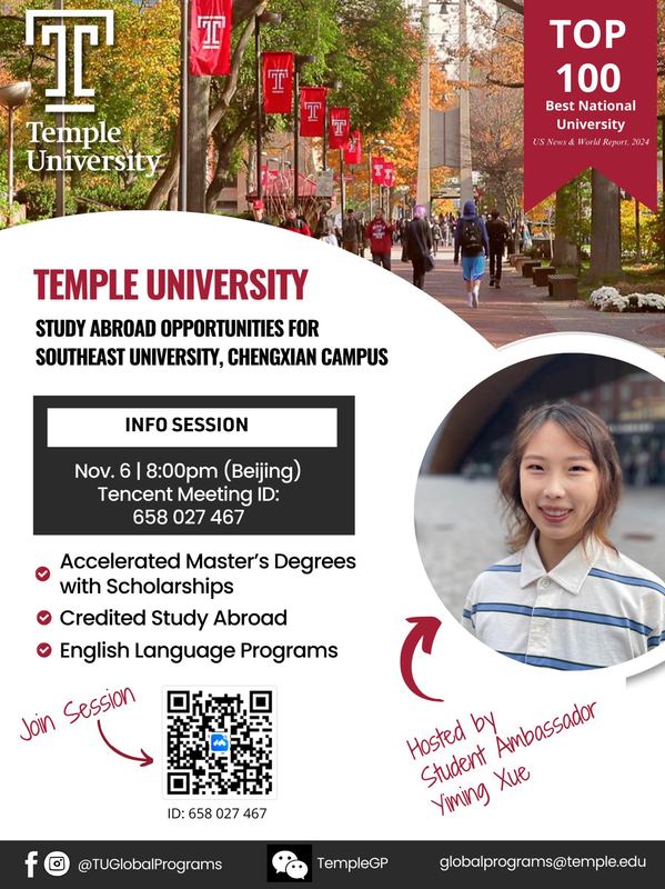 美国天普大学是与开云签署合作交流协议的大学之一。为了更全面了解该大学专业设置、项目优势、申请硕士条件及校园生活等内容,美国天普大学拟将为开云学生举办“开云kaiyun官方网站线上宣讲会”,具体安排如下: