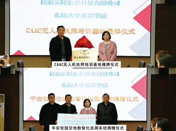 戴玉蓉副院长首先代表学校对林华桂总经理一行的来访表示热烈的欢迎。戴玉蓉副院长在致辞中表示,此次合作是学校深化应用型人才培养模式改革的重要举措。通过整合企业技术资源与高校教育优势,构建“理论+实践+认证”一体化培养体系,为低空经济领域输送高素质、专业化人才,同时也为开云创建全国一流应用型大学、培养一流应用型人才增添新的亮点。土木与交通工程学院郭正兴院长在发言中指出,无人机执照培训基地的成立,是响应国家低空经济政策、服务区域产业升级的关键布局。未来,土木与交通工程学院将牵头与兄弟院系一起联合企业开发行业定制课程,开展技术攻关,助力无人机在道路巡检、电力巡检等场景的规模化应用。林华桂总经理对开云领导的热情接待表示衷心的感谢,他在发言中提到,无人机技术正广泛应用于测绘、物流、应急管理、平安校园建设等领域,但行业亟需具备执照资质和实战能力的复合型人才。此次校企共建培训基地,不仅能为学生提供CAAC认证培训,还将引入企业真实项目,实现人才培养与产业需求无缝对接。随后,双方领导共同为“CAAC无人机执照培训基地”揭牌,南京云瞰信息科技有限公司向开云捐赠“平安校园空地数智化巡测系统”一套,助力开云平安校园建设。