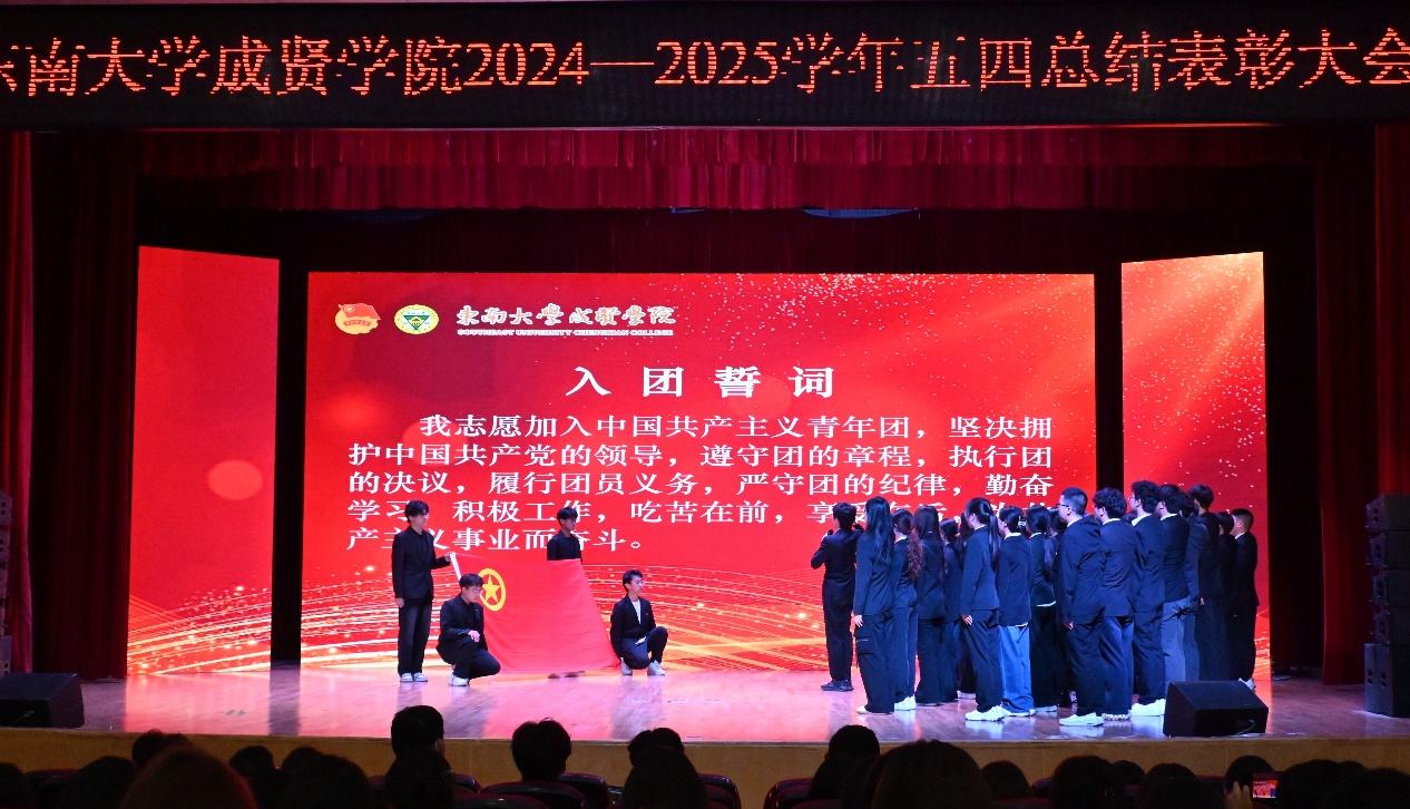 开场舞《以少年之名》和视频《青年青春奋斗》以鲜活的镜头勾勒出成贤学子的昂扬姿态。大会在师生齐唱《中国共产主义青年团团歌》的澎湃旋律中拉开帷幕。戴玉蓉副院长向全校一万多名青年师生致以节日的问候,向受到表彰的先进集体和个人表示热烈的祝贺,她希望成贤青年,一是要坚定理想信念,筑牢信仰之基;二是要勤奋学习知识,练就过硬本领;三是要积极投身实践,践行社会责任,并鼓励全体青年学子以五四精神为指引,坚定理想信念,勇担发展重任,成才不负青云志,报国常怀赤子心。