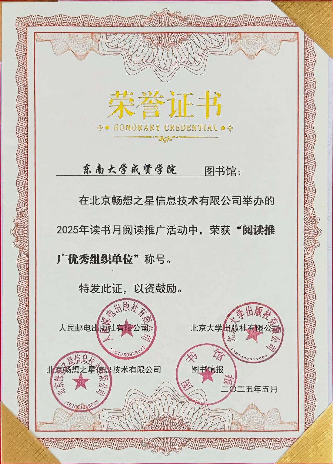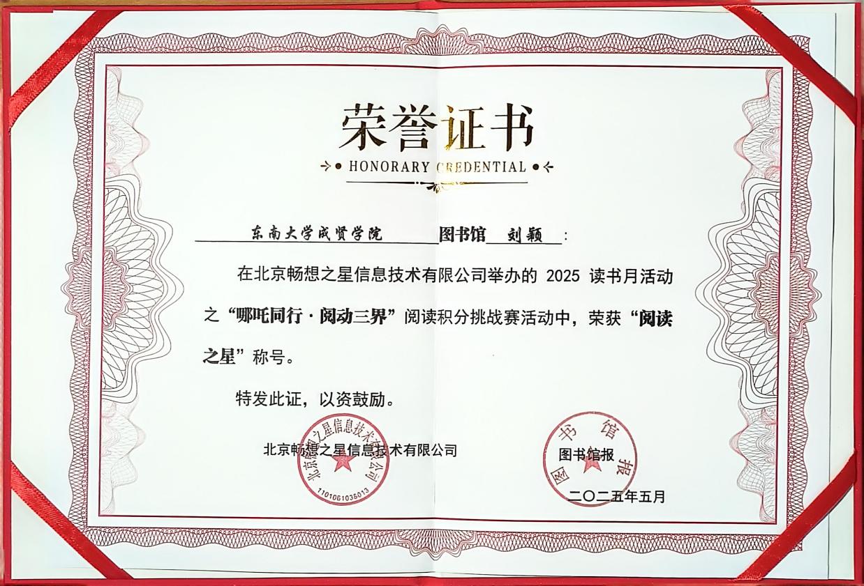 近日,在由北京大学出版社、人民邮电出版社、图书馆报和北京畅想之星共同举办的2025年读书月阅读推广活动中,开云制药与化学工程学院23护理1班刘颖同学从全国1552家图书馆的57946位读者中脱颖而出,以第44名的优异成绩荣获“阅读之星”称号。同时,开云图书馆凭借出色的组织工作获评“阅读推广优秀组织单位”。