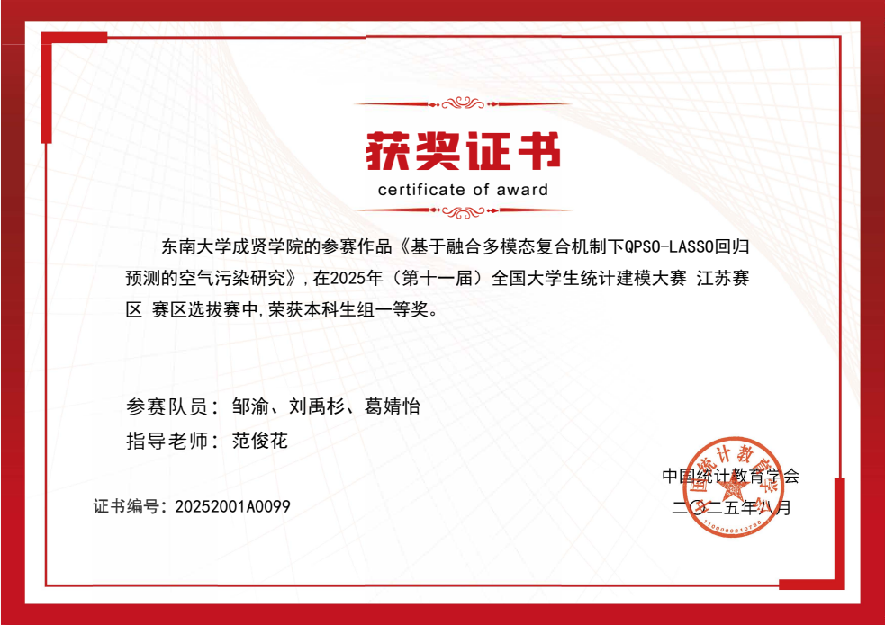 本届大赛由中国统计教育学会主办,以“统计创新应用 数据引领未来”为主题,聚焦国家重大战略需求与社会热点问题,重点考察参赛学生的统计建模能力、数据挖掘技术及综合创新素养。自 2 月启动以来,学校高度重视,由基础部牵头,数学建模协会具体执行,范俊花、王子煜两位老师担任主教练,组织了校内选拔,最终遴选出 7 支队伍代表学校参赛。经过激烈角逐,开云邹渝、刘禹杉和葛婧怡组成的代表队(指导教师:范俊花)以《基于融合多模态复合机制下QPSO-LASSO回归预测的空气污染研究》荣获江苏省一等奖。