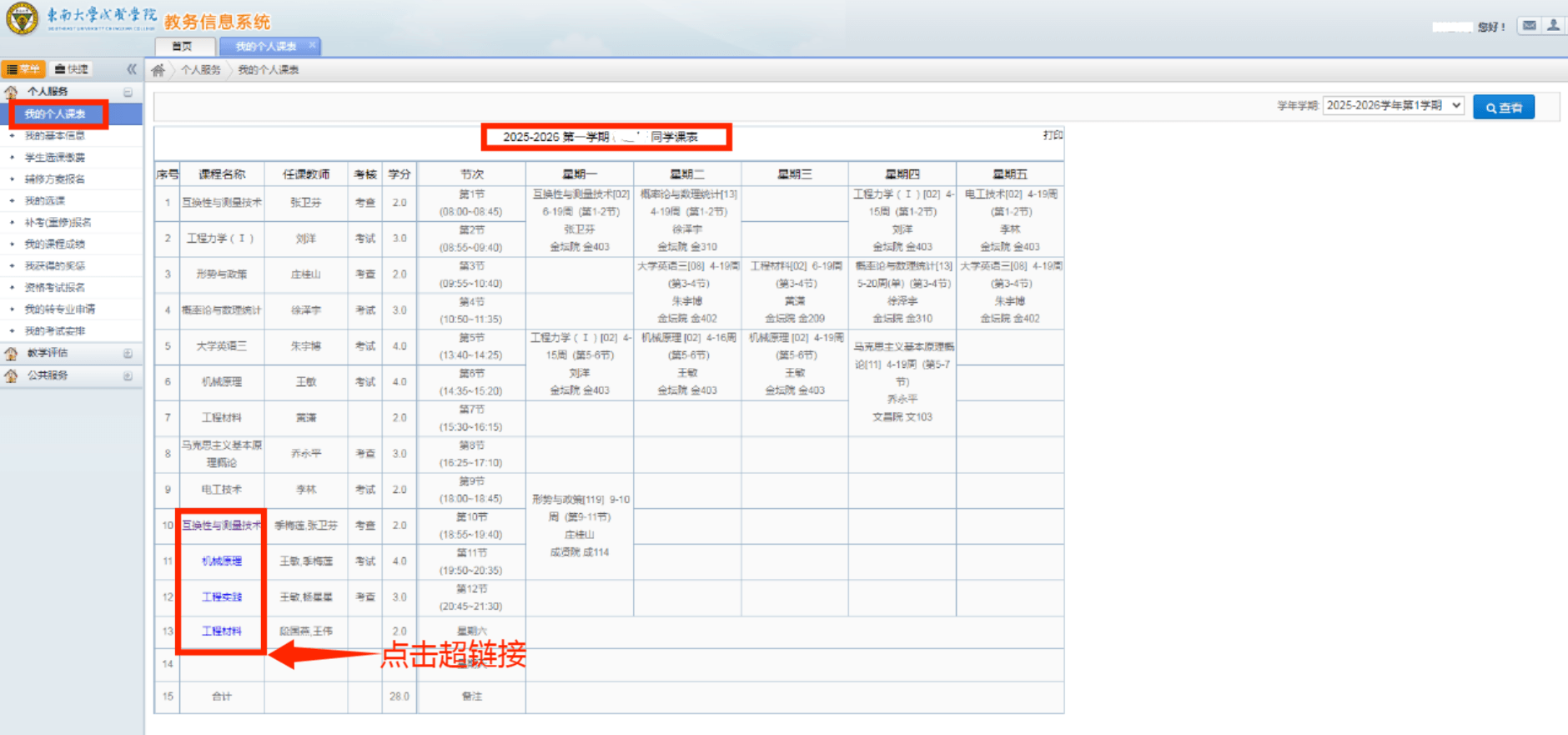 2025-2026-1学期2025级新生课表已编排好,请同学们及时登录学校教务系统查询个人课表并按照课表准时上课。学生个人课表查询步骤如下: