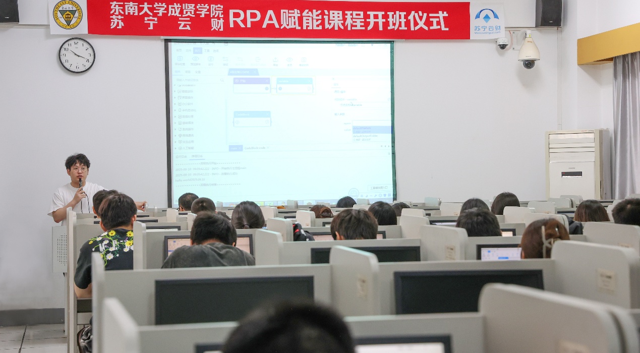 9月10日上午,经济管理学院与苏宁云财RPA赋能课程开班仪式在华馆302教室举行,苏宁云财总经理陈礼,副总经理曹红、钟方玲等一行11人,经济管理学院院长戚啸艳、副院长高凯丽等,学生代表69人参加了此次开班仪式。