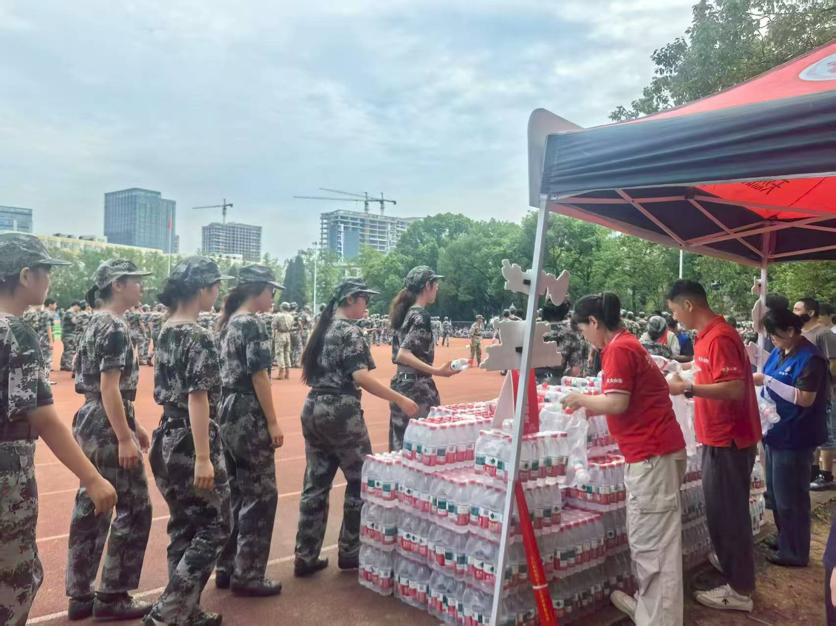 虽已立秋,但军训期间的温度仍然“热情高涨”。后勤管理处心系参训教官和新生,经过前期积极沟通,联合中超超市为广大新生每人赠送了开学第一瓶水。