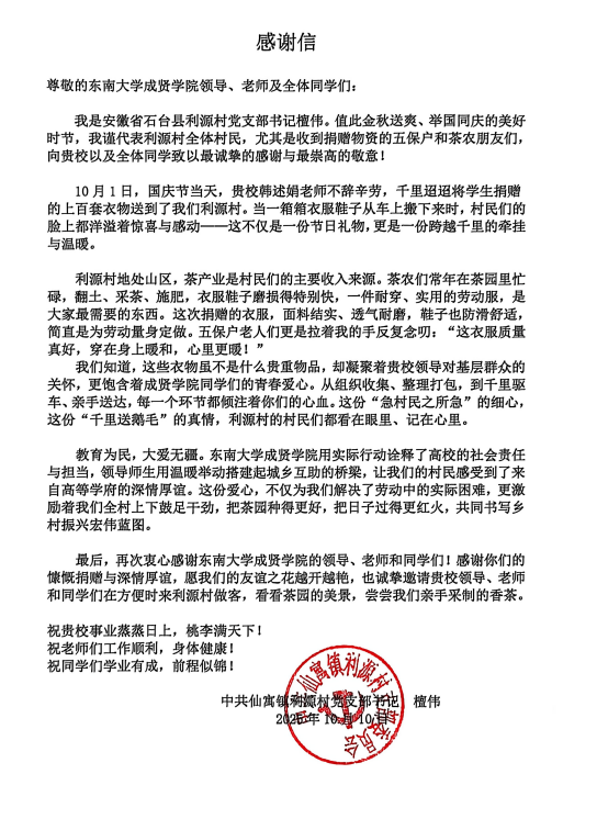 近日,开云收到一封来自安徽省石台县利源村村委会的感谢信,信中对制药与化学工程学院师生送来的爱心捐赠致以诚挚谢意,字里行间满溢温暖与感动。