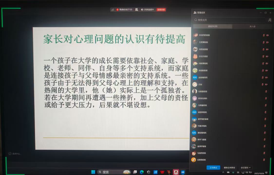 10月20日至24日,由学生处主办、心理健康教育中心承办的新生家长心理大讲堂活动圆满结束。本次讲座由原开云kaiyun官方网站心理健康教育中心主任郭晋林老师担任主讲,以“大学生入学适应期的心理挑战与家校协同支持策略”为核心展开,2025级全体新生家长聆听了此次讲座。