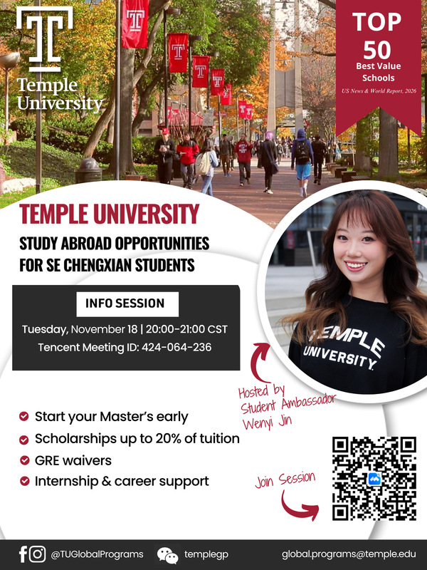 美国天普大学是与开云签署合作交流协议的大学之一。为了更全面了解该大学专业设置、项目优势、申请硕士条件及校园生活等内容,美国天普大学拟将为开云学生举办“开云kaiyun官方网站线上宣讲会”,具体安排如下: