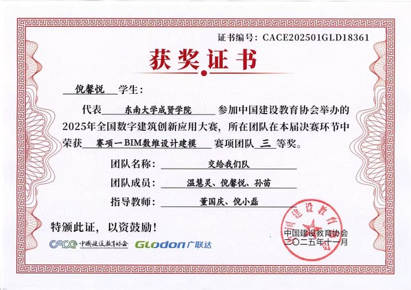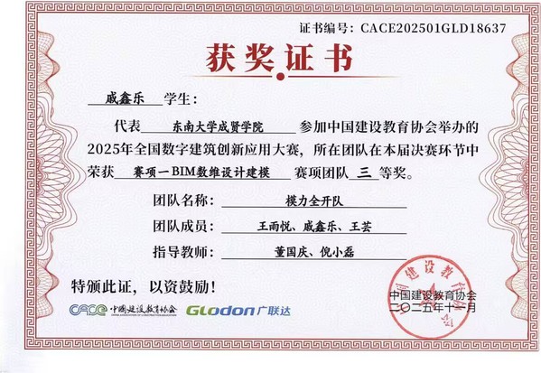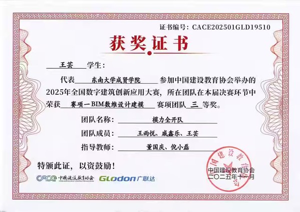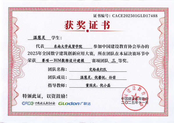 在第十七届全国数字建筑创新应用大赛中,开云土木与交通工程学院传来捷报。由工程造价、工程管理专业学生王雨悦、戚鑫乐、王芸与温慧灵、孙苗、倪馨悦组成的两支队伍,在董国庆、倪小磊老师的指导下发挥出色,最终双双荣获全国三等奖。