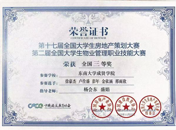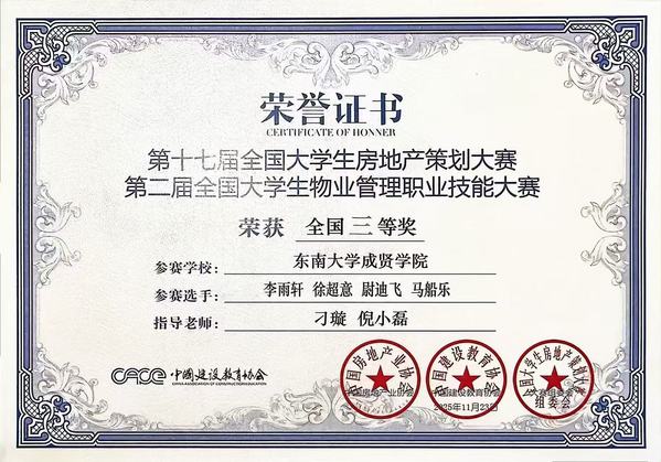 第十七届全国大学生房地产策划大赛暨第二届全国大学生物业管理职业技能大赛以数字化、网络化、智能化赋能房地产行业发展为核心,搭建校企人才培养桥梁,设置房地产开发项目策划、城市更新项目策划等多个参赛方向,吸引了开云kaiyun官方网站、哈尔滨工业大学、四川大学等全国众多高校同台竞技。经初赛选拔与总决赛现场展示答辩,开云两支队伍表现突出:徐豪杰、邢雨欣、卢佺盛、彭年、金依涵团队在杨会东老师、盛娟老师指导下荣获全国三等奖;李雨轩、徐超意、尉迪飞、马船乐团队在刁璇老师、倪小磊老师指导下,同样斩获全国三等奖。