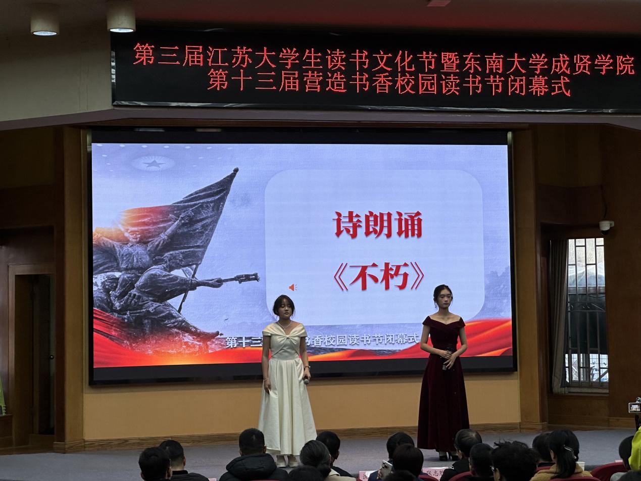 活动现场还有同学带来精彩演出,话剧《红岩》选段精彩再现77年前,渣滓洞监狱里,许云峰等革命先烈面对特务的酷刑与利诱,始终坚守信仰、宁死不屈的红岩精神,并以许云峰先烈的口吻,展开了一场“跨越时空的对话”,勉励同学们静下心来多多阅读《红岩》。配乐诗朗诵《不朽》,用深情的诉说穿越时空,将抗战英雄的故事与当下的和平生活相连,既是对无名英雄的深切缅怀,也是对“英雄精神永传承”的坚定承诺,现场师生无不情动于中。
