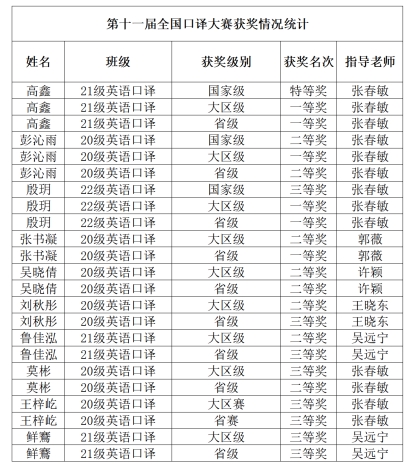 4月7日,第十一届全国口译大赛总决赛于线上落幕,437ccm·必赢国际口译研究生高鑫获得大赛全国特等奖(季军)、彭沁雨获得全国二等奖、殷玥获得全国三等奖,张书凝、吴晓倩、刘秋彤、鲁佳泓获得大区级二等奖,莫彬、王梓屹、鲜鶱获得大区级三等奖,指导老师吴远宁教授、张春敏教授、郭薇副教授、许颖副教授、王晓东副教授获得“优秀指导老师”奖。